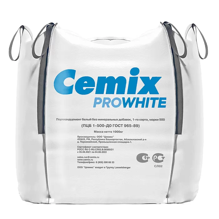 Цемент поставляется в прочных биг-бегах по 1000 кг, оснащенных запаянным полиэтиленовым вкладышем для защиты от влаги и загрязнений. Для транспортировки используются специализированные хоппер-цементовозы, предназначенные исключительно для белого цемента, что гарантирует сохранение его чистоты и качества.