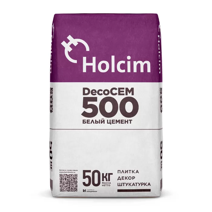 Портландцемент белый Holcim DecoCEM 600, марка 500 (ПЦБ 1-500-Д0) — это профессиональный вяжущий материал, произведенный на Щуровском цементном заводе (Россия). Отличается высокой степенью белизны (коэффициент отражения ≥83%), что позволяет создавать эстетически привлекательные и долговечные декоративные поверхности.
